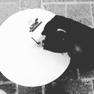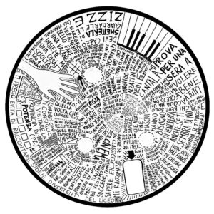 Un giorno Fabrizio mi scrive e mi chiede se ho voglia di disegnare su uno dei tavoli del suo Kestè come hanno già fatto tanti artisti e illustratori della città. Ovviamente accetto, ma mi chiedo cosa potrei fare di diverso da un semplice quadro tondo e da esporre in orizzontale, per di più usato come tavolo di un locale notturno. Quindi penso di partire proprio da questo, e cioè dall’uso, e provo a incastrare tra loro giochini, battute e spunti per argomenti (nel caso sul tavolo dovesse calare il silenzio di un primo appuntamento).